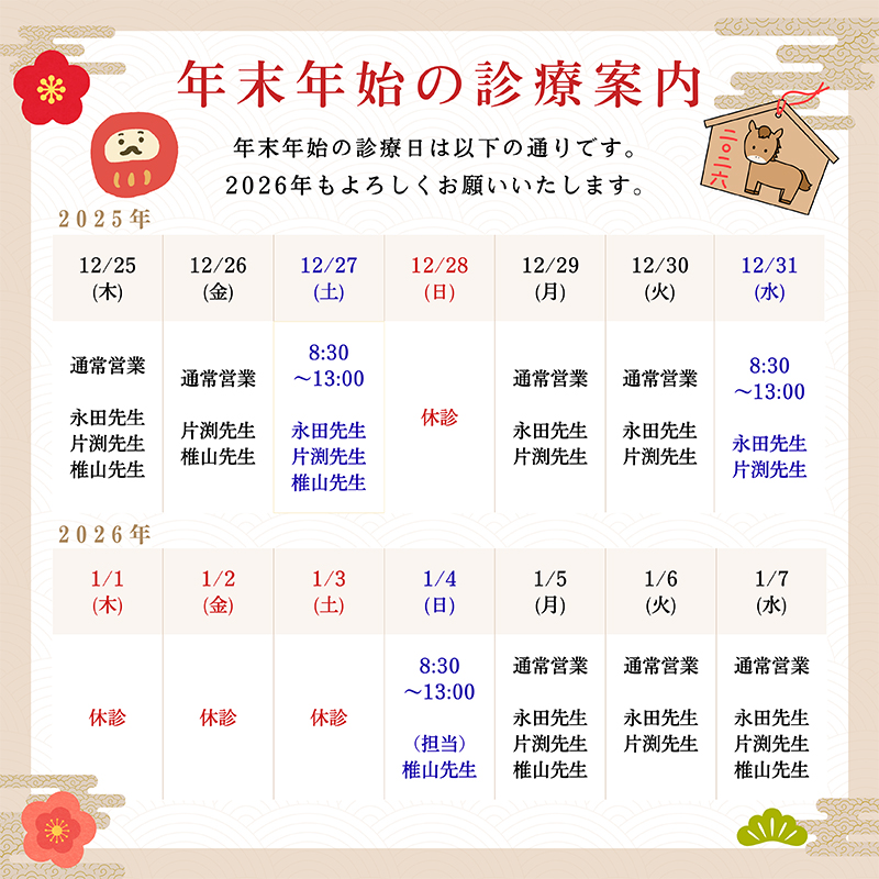 年内の診療は12月31日まで、年始は1月4日より診療いたします。
